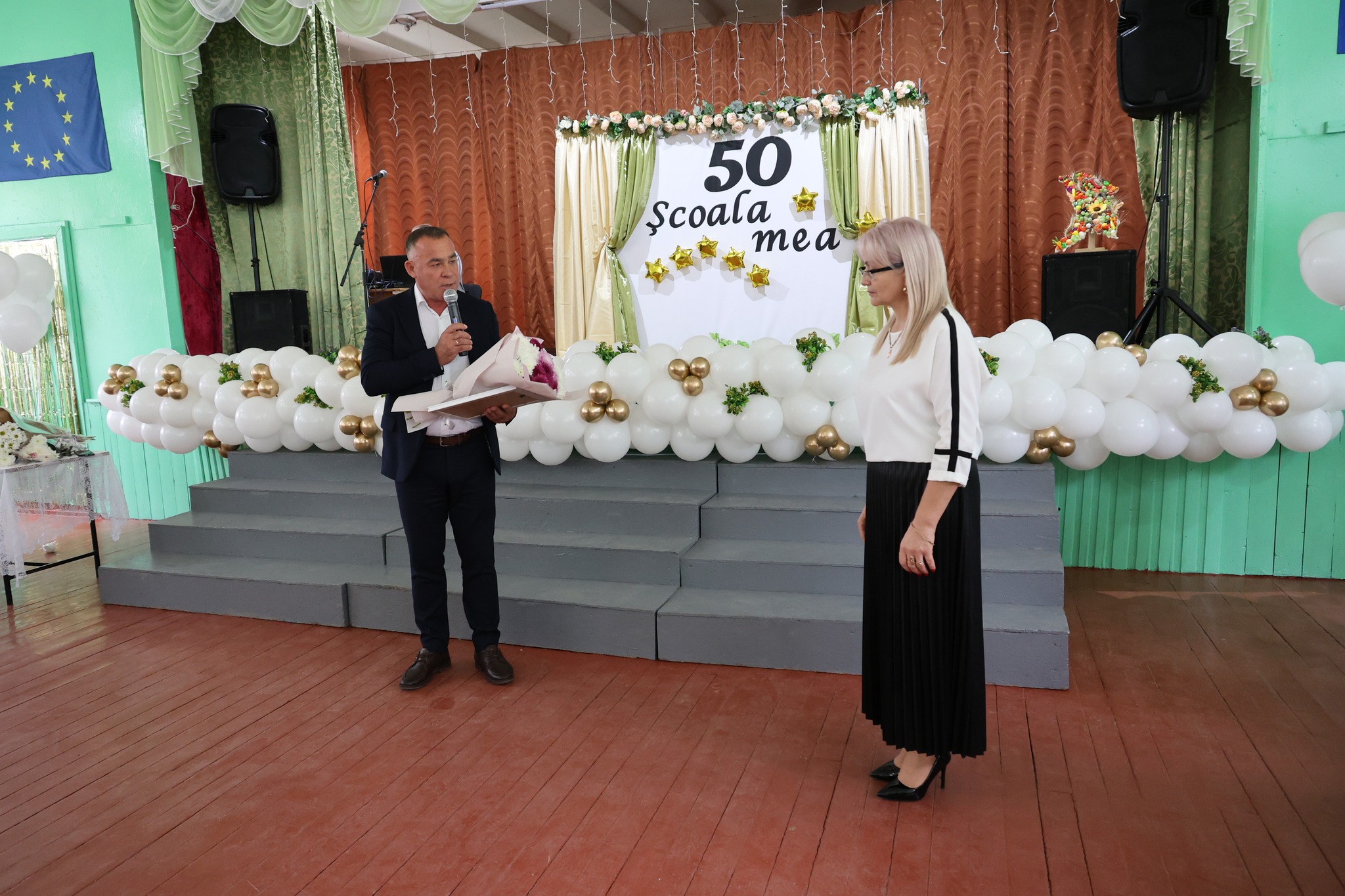 Președintele raionului Drochia, Vasile Cemortan, în luarea sa de cuvânt a adresat felicitări și a exprimat gratitudinea comunității școlii pentru reușite și contribuția la promovarea imaginii învățămîntului drochian, oferind dnei Ludmila Grigor, directoare a instituției, diplomă aniversară și desigur flori.