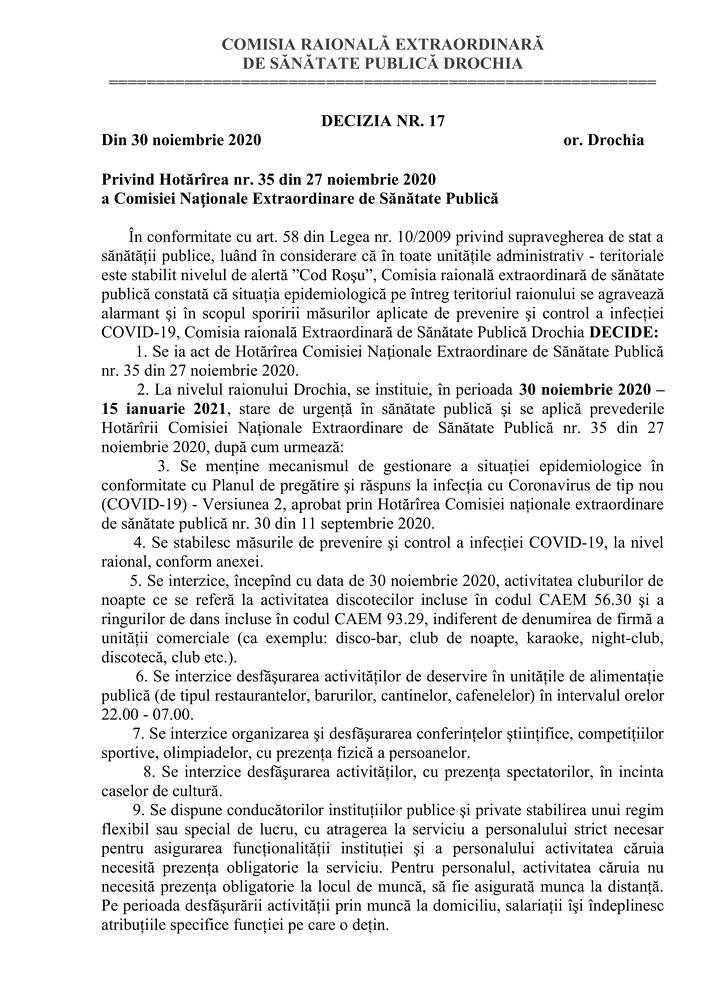 Ca rezultat, a fost adoptată Decizia nr. 17 din data de 30.11.2020 ce prevede că, la nivelul raionului Drochia, se instituie, în perioada 30 noiembrie 2020 – 15 ianuarie 2021, stare de urgenţă în sănătate publică și se aplică prevederile Hotărârii Comisiei Naționale Extraordinare de Sănătate Publică nr. 35 din 27 noiembrie 2020.