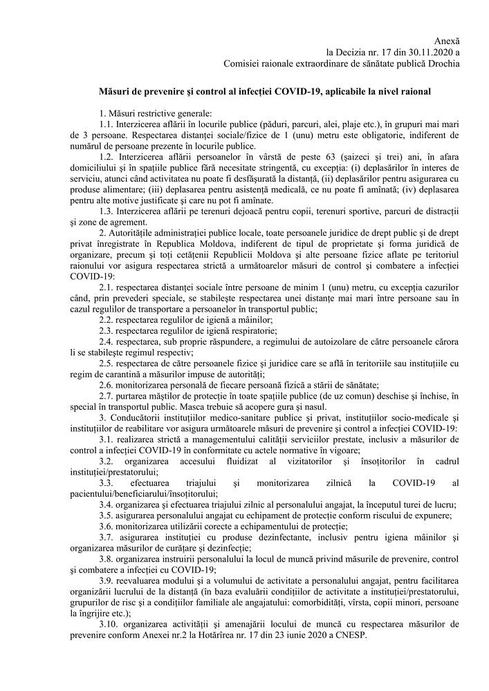 Totodată, s-au stabilit măsurile de prevenire și control a infecției (COVID-19) aplicabile la nivel raional, conform anexei din Decizia sus menționată.